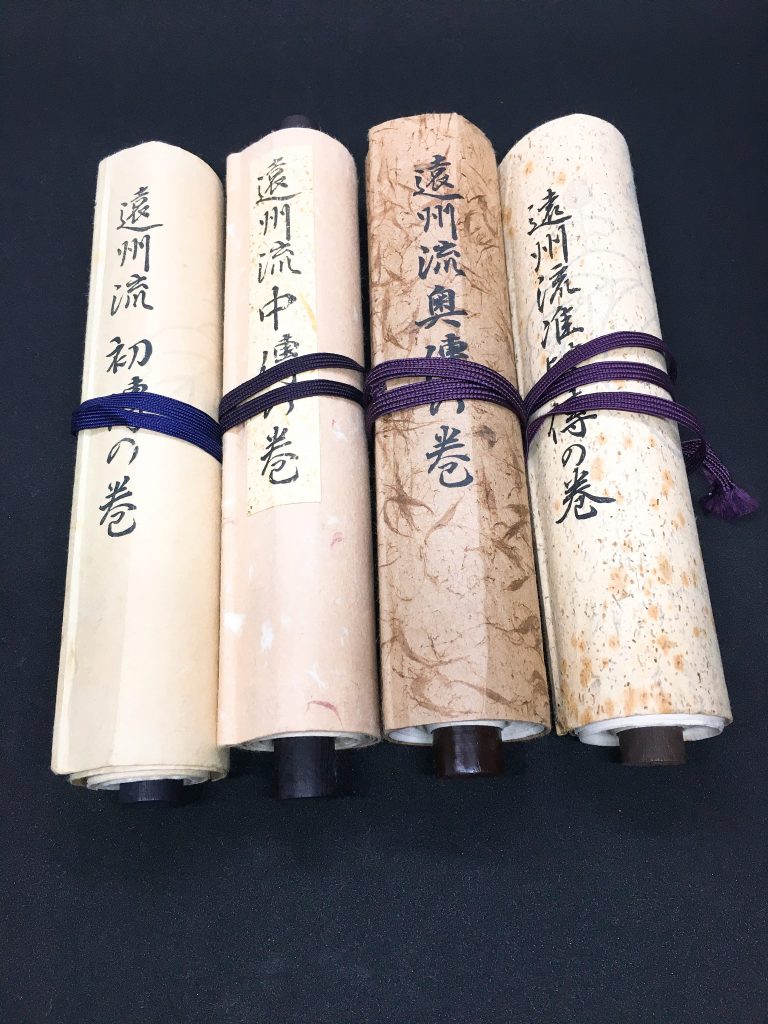 遠州流の花器、花の生け方について書かれいる巻物を4巻。丁寧な字でわかりやすく書かれています。
