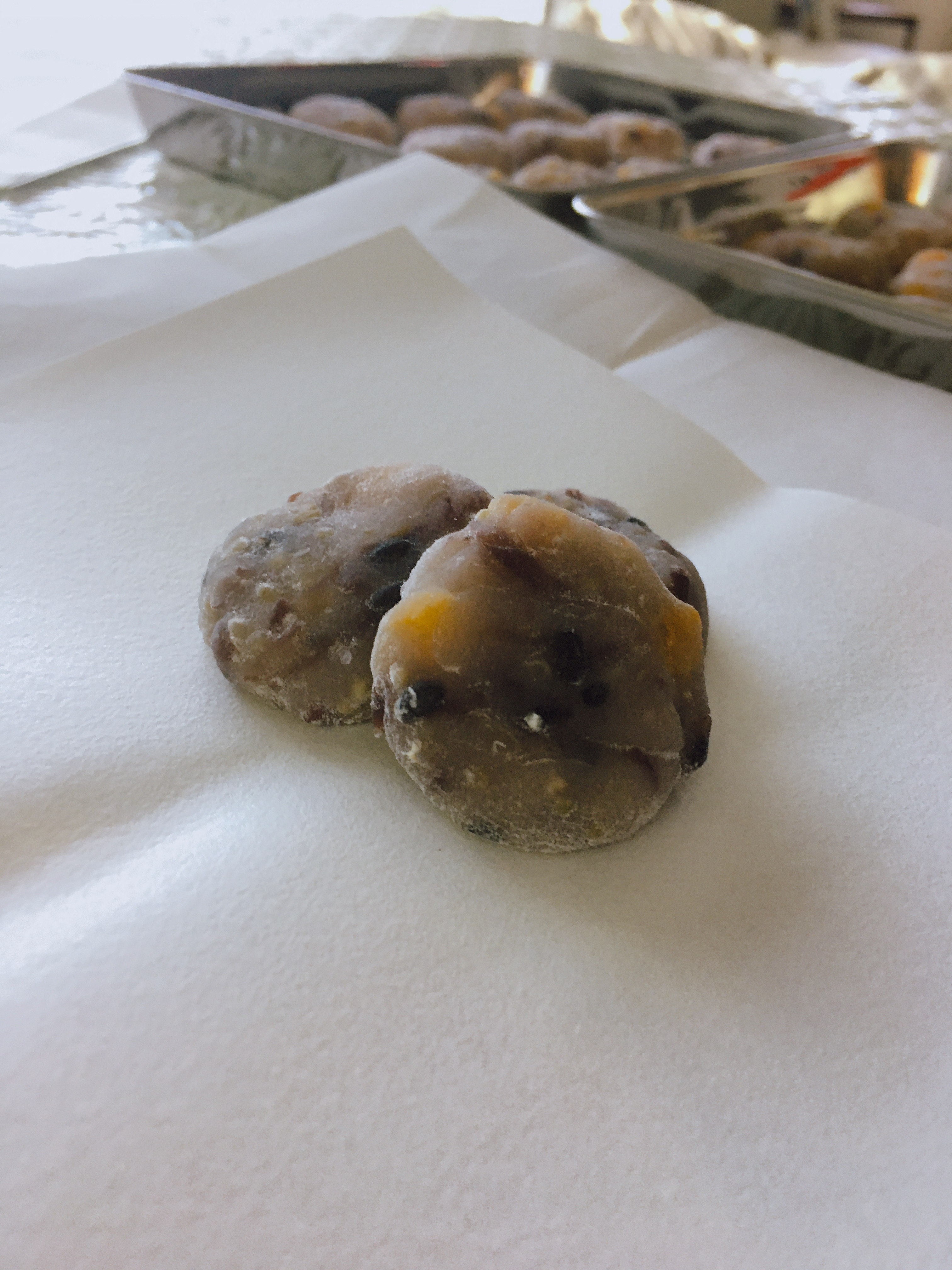 餅には、粟・ひえ・胡麻・麦・紫黒米などの雑穀と、干杏子と粒餡をまぜて蒸したもの。