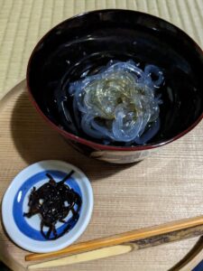 茶事倶楽部 和の心~心で涼を感じる 2023.09.06 まだまだ暑いですね 先日のお稽古日の菓子は、 「ところてん」 黒砂糖とお水だけを コトコト煮込んで シンプルな黒蜜に。 煮物椀を菓子椀に見立て ちょっとだけ遊び心を入れて ちょっと良い昆布を箸休めに。 体感は暑いけど 心は涼やかに 茶の心。ですね。 しっかり楽しく食べて 残暑、乗り切りましょうね 重陽の月~立礼・正午茶事~ 前の記事 秋は確実に 次の記事